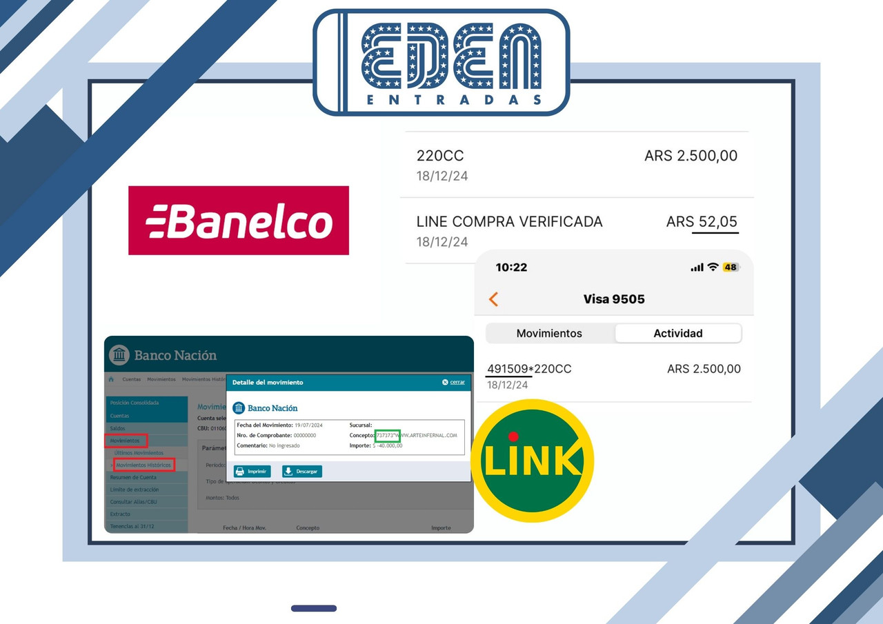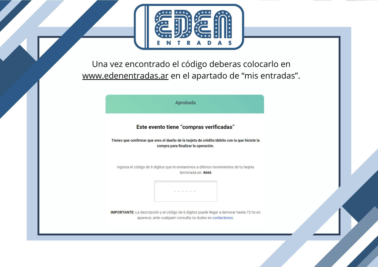 Esta opción está disponible desde el primer día de la venta hasta 5 días antes del evento. El cliente debe esperar hasta 72 horas hábiles para cualquier tarjeta. En el caso de Tarjeta Naranja, la espera puede extenderse hasta 10 días. El código de autorización está compuesto por 6 dígitos y un asterisco ()* . Una vez que deje de figurar, el cupón se añadirá a la cuenta con el código y el nombre del evento. Recuerda no incluir el asterisco al verificar.