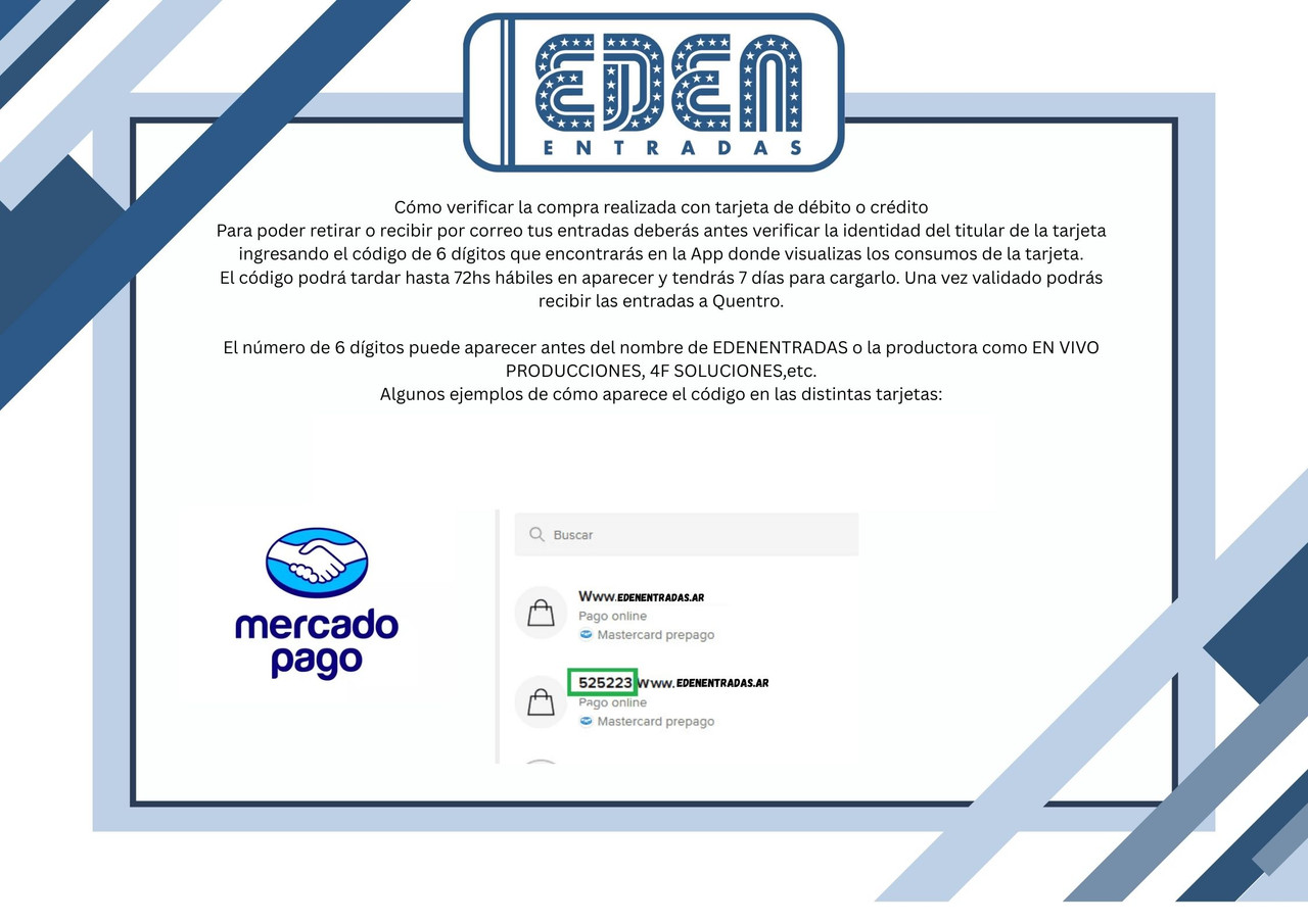 Este evento requiere verificación de compra para confirmar tus tickets. Una vez verificado, podrás canjear tu compra en QUENTRO. Su compra será reembolsada automáticamente en el caso de que no haga la verificación luego de 10 días posteriores realizada la compra.