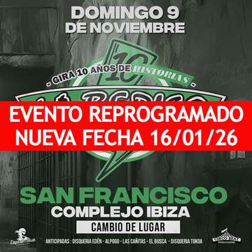 Informamos que el show de La Beriso, previsto para el Domingo 9 de Noviembre de 2025 a las 20:00 hs en el Complejo Ibiza de San Francisco, Córdoba, ha sido reprogramado para el viernes 16 de enero de 2026 en el mismo lugar.